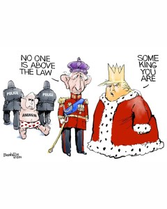 In other words, he could not behave like a king. He could no longer go around the world threatening other leaders whenever it suited him. He could no longer ignore the law, existing U.S. treaties, or the role Congress is assigned by the Constitution. He said he could—he said he didn’t need Congress to impose the new types of tariffs he mentioned during his press conference. But that was either denial or ignorance or a special Trumpian combination of both.