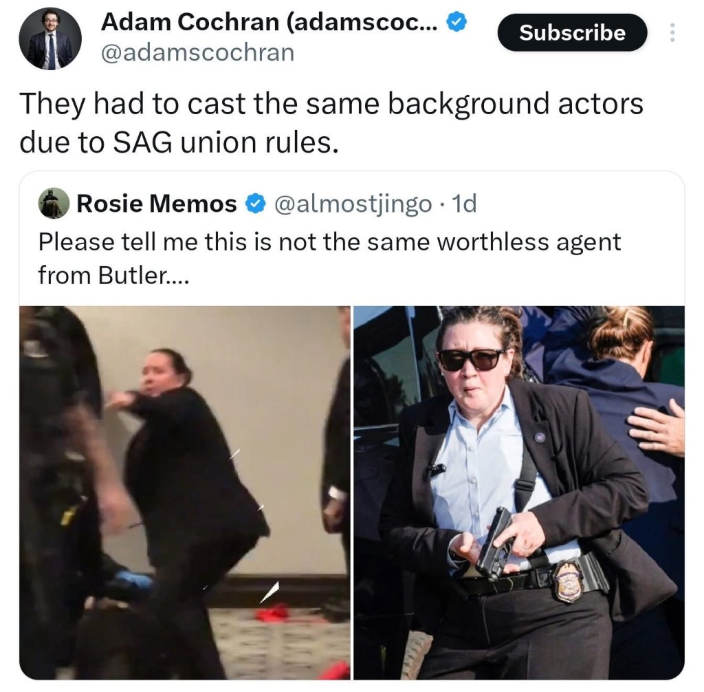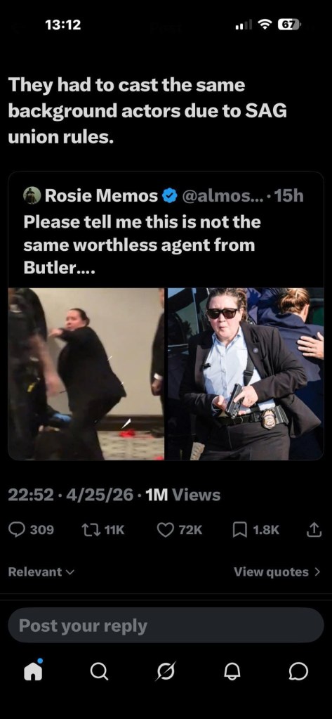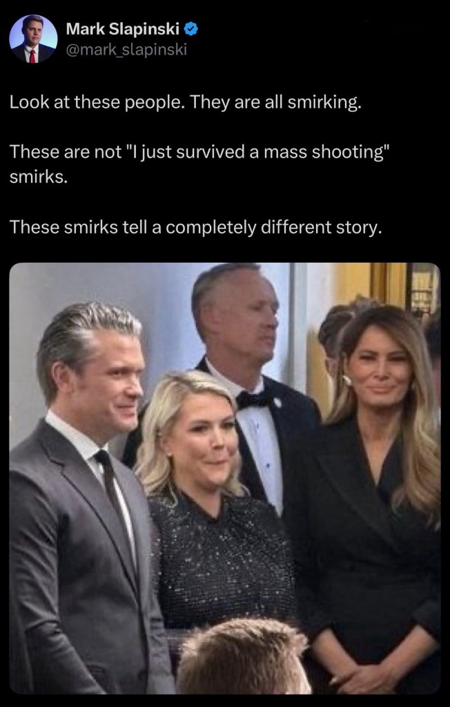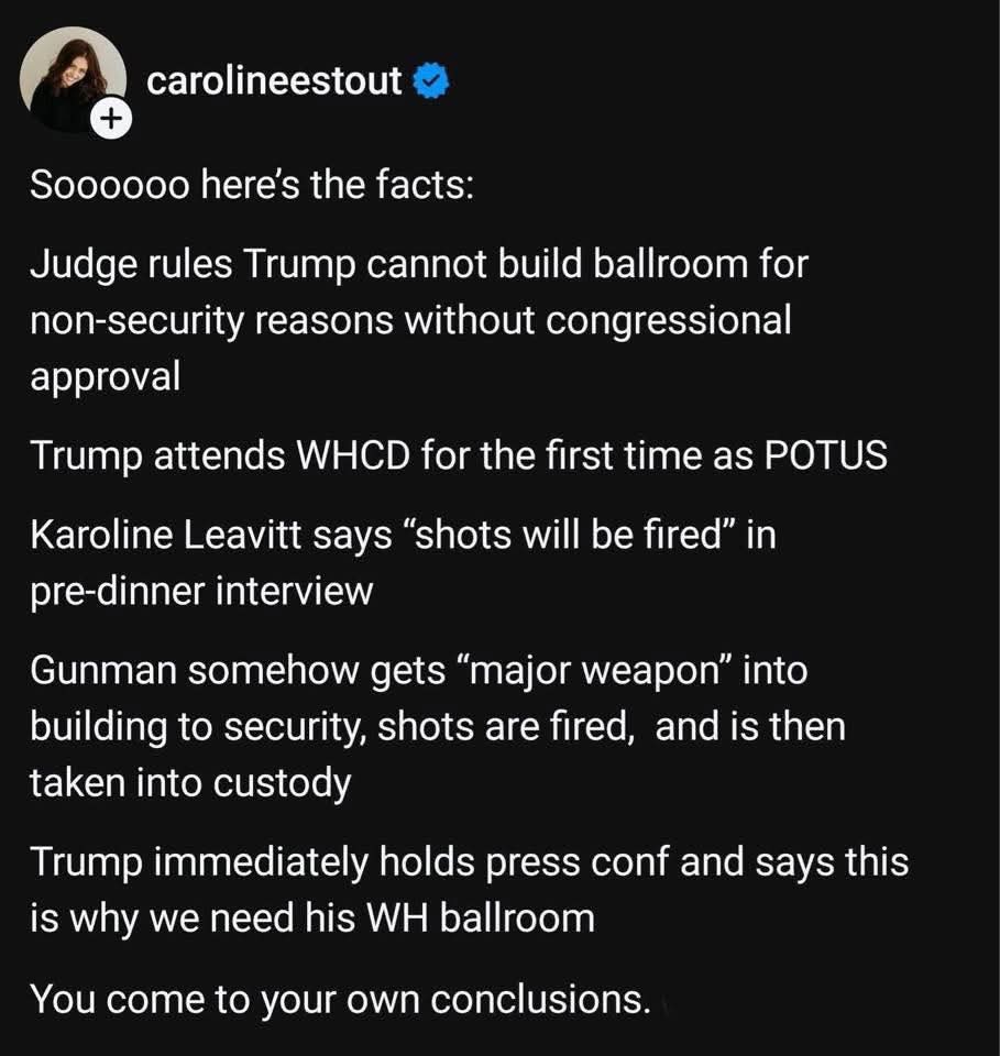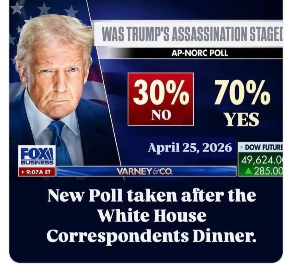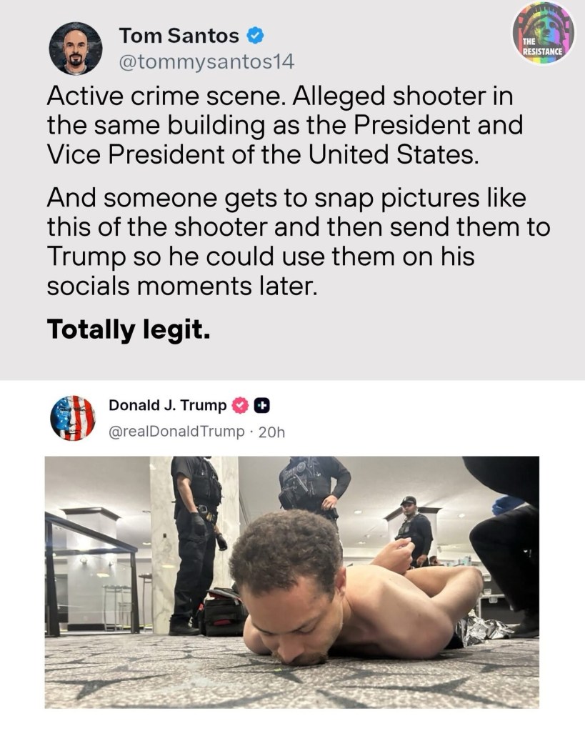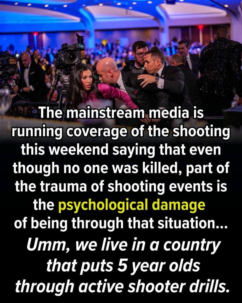 Shots fired, the Secret Service rushes in, and they let Trump continue to sit there? And now they’re going to resume the White House Correspondents’ Dinner, and Trump still plans to deliver a speech?I’m not saying this was staged to boost Trump’s tanking approval numbers, but it looks odd.