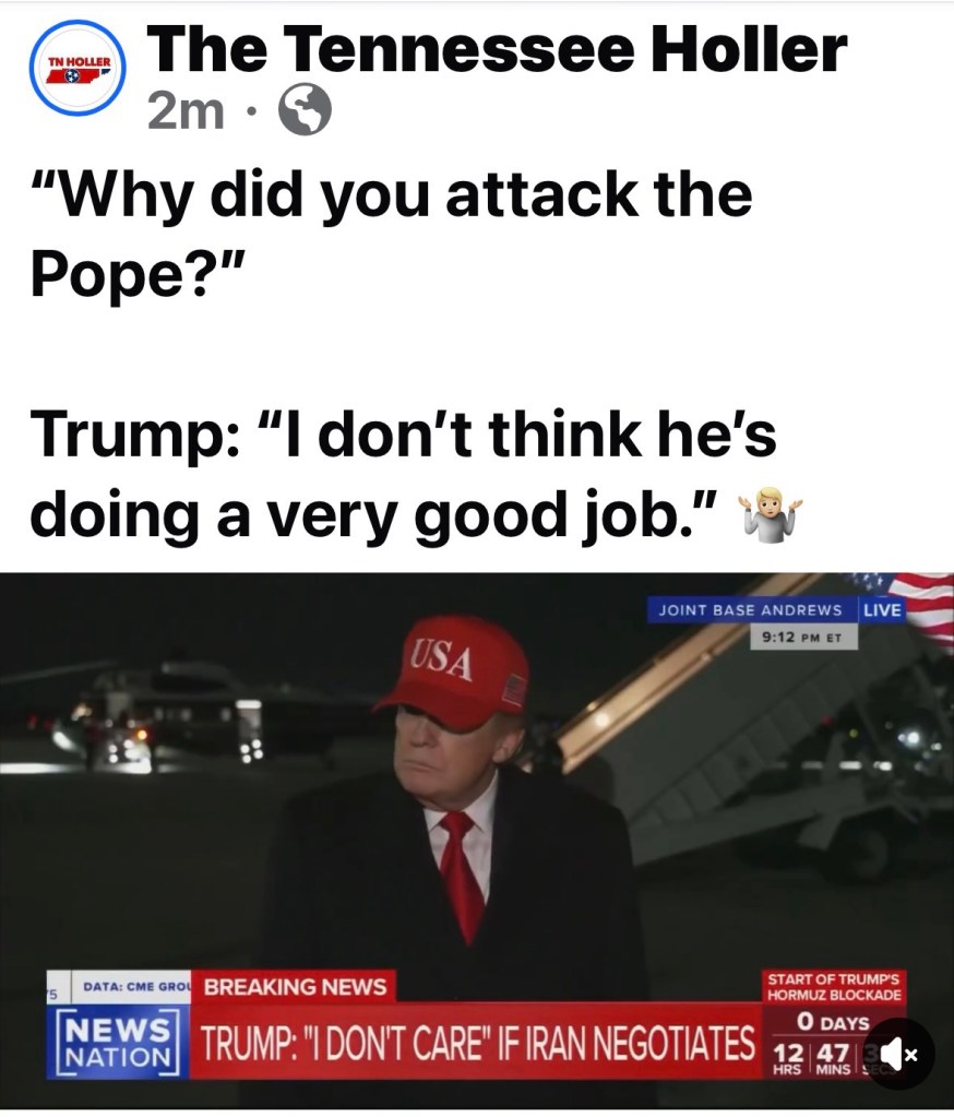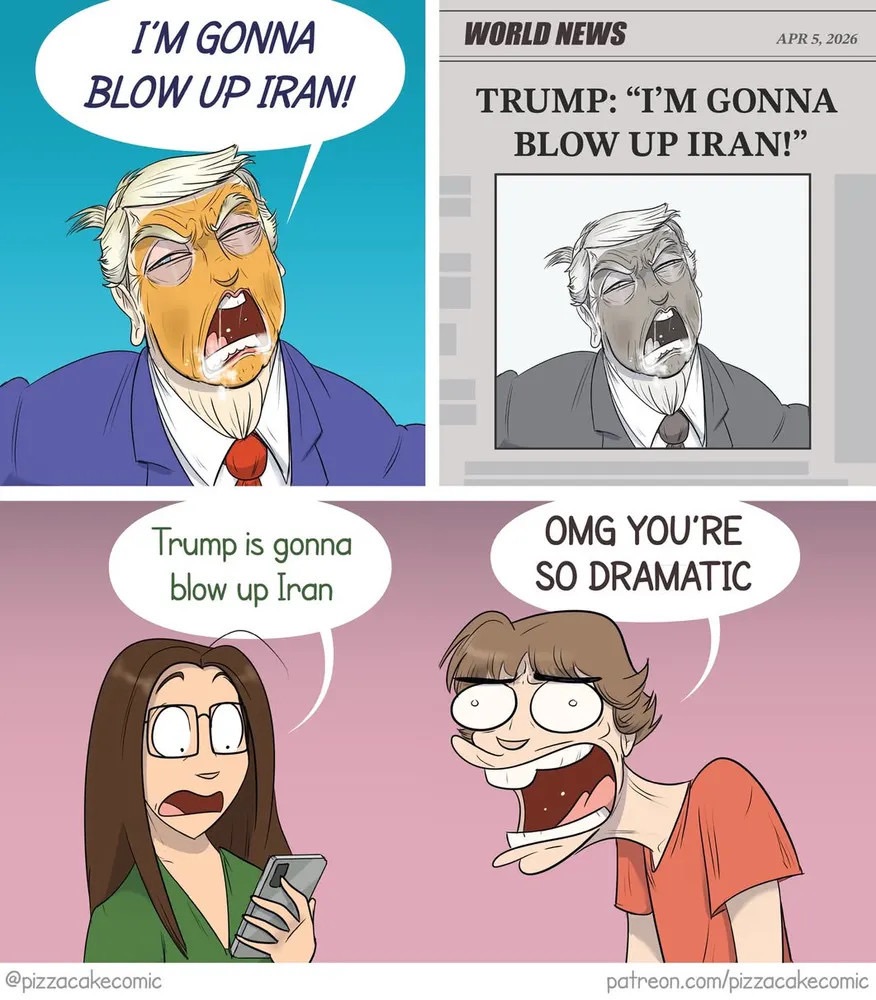 Once again, there’s no news fit to report, but I’m going to take a stab at it. The headlines run the gamut. There are headlines that make you want to laugh, like “Melania Trump says she was not associated with Jeffrey Epstein.” Headlines that make you want to cry, like “Consumer prices rose 3.3% in March, as energy prices spiked due to Iran conflict.” Headlines to make you angry, like “Pete Hegseth’s holy war: the militant Christian theology animating the US attack on Iran.” There are also headlines that make you feel quite unsurprised, like “Calls to Impeach Trump Collide With Reluctant Democratic Leadership.” Once again, it’s a week that leaves us all worse off.