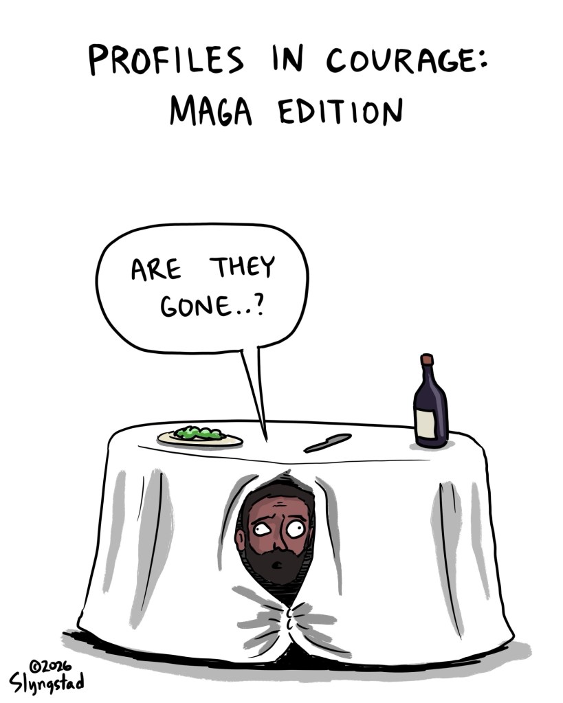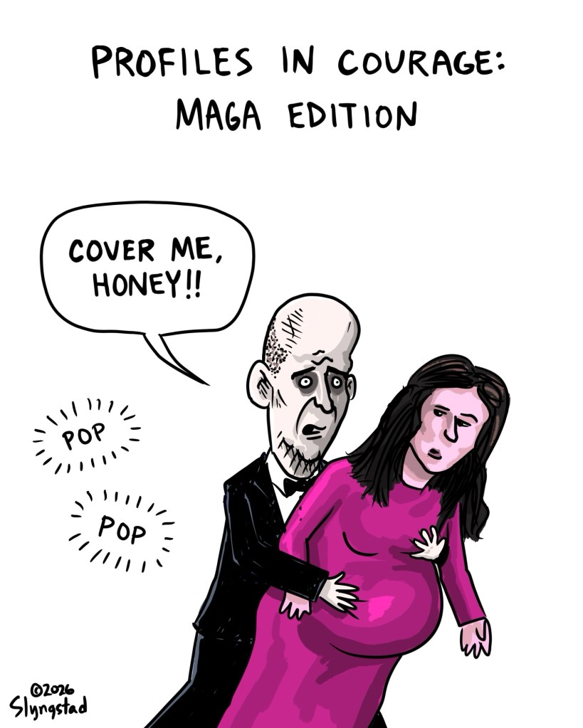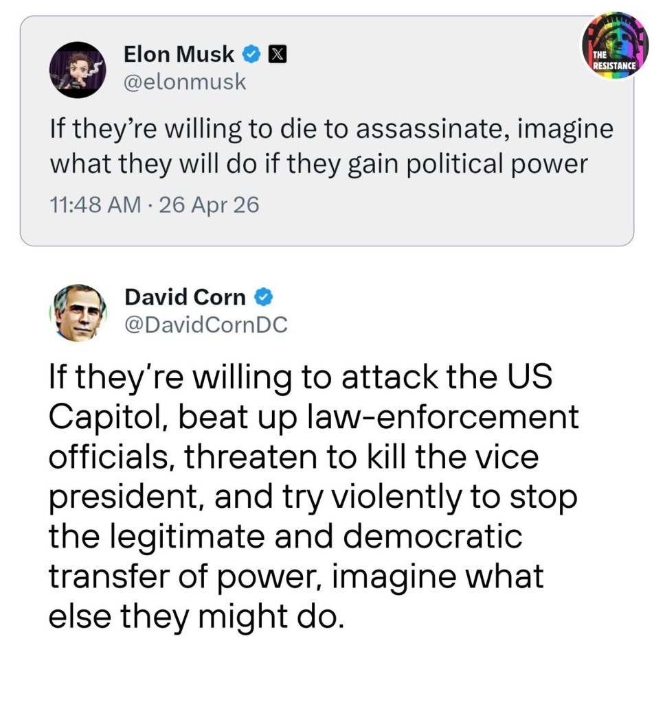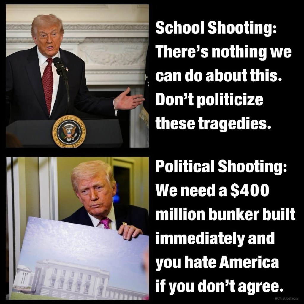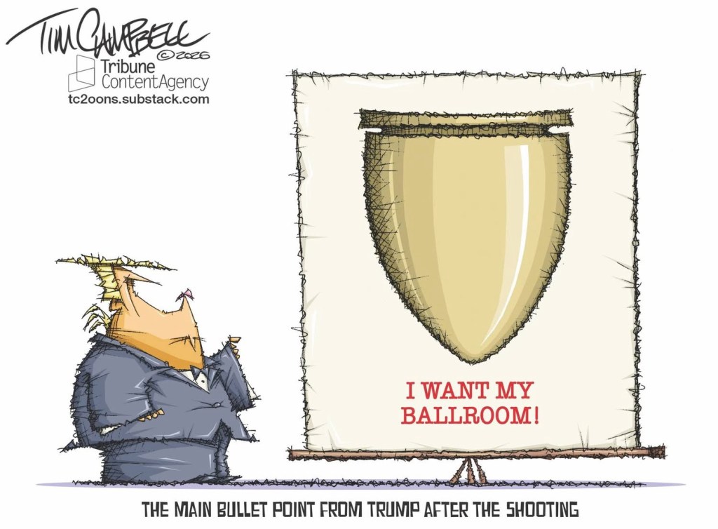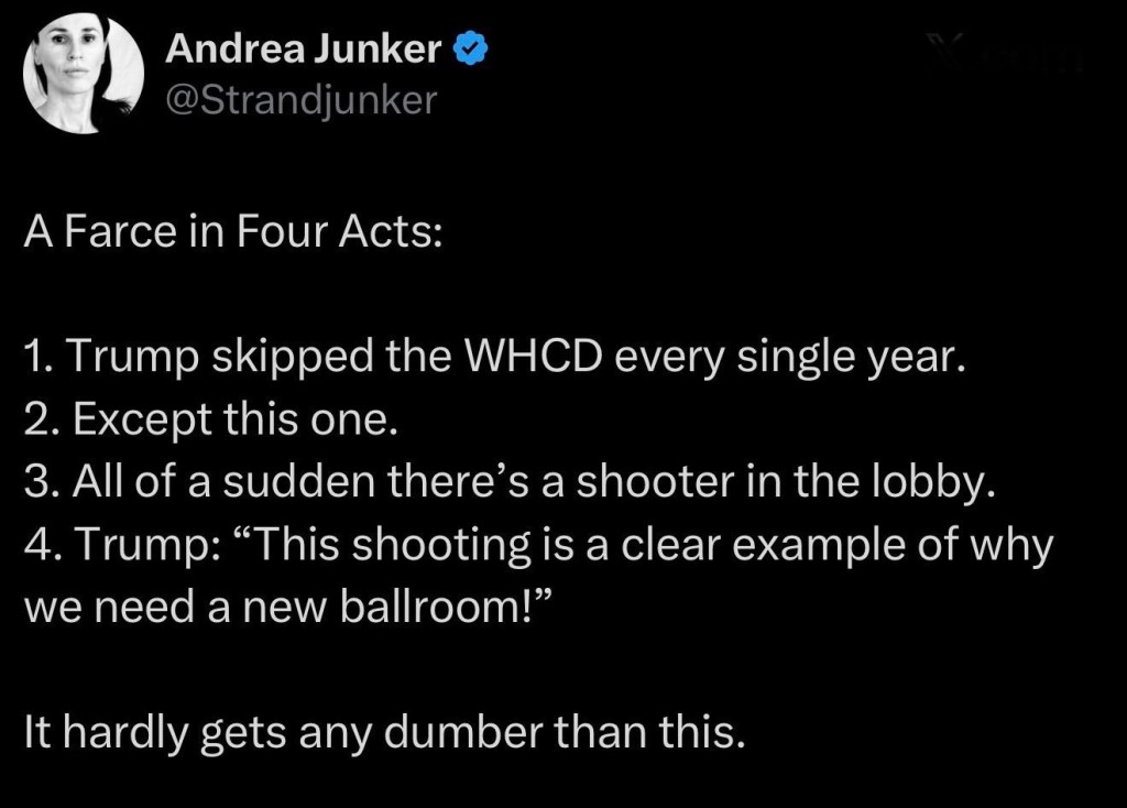 Doomsday Scenario, this morning. “The Trouble with Trump’s Bunker and Ballroom. Is he building it to sustain an attack — or the end of democracy?” If anything, it was crystal clear that the entire Trump performance on Saturday night was to secure his Ballroom by showing that any other place would be insecure. However, the Correspondent’s dinner is associated with a professional society, and it’s difficult to see how it connects directly to Trump’s plea.