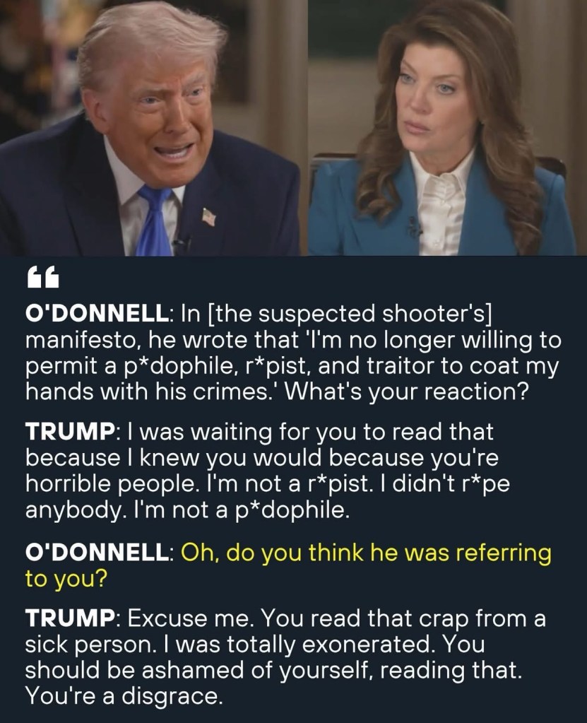 But when O’Donnell, during an interview recorded at the White House on Sunday, quoted from the accused gunman Cole Allen’s apparent manifesto — “I am no longer willing to permit a pedophile, rapist, and traitor to coat my hands with his crimes,” she read — Trump, who’d been relatively subdued in his responses, flashed a familiar anger.