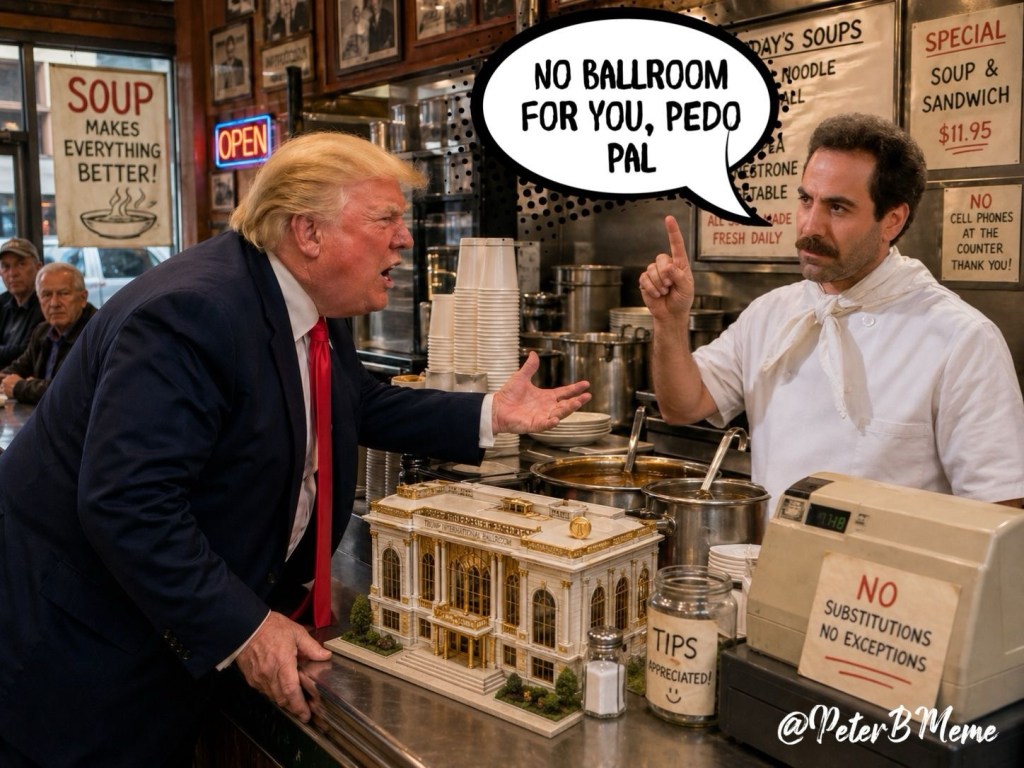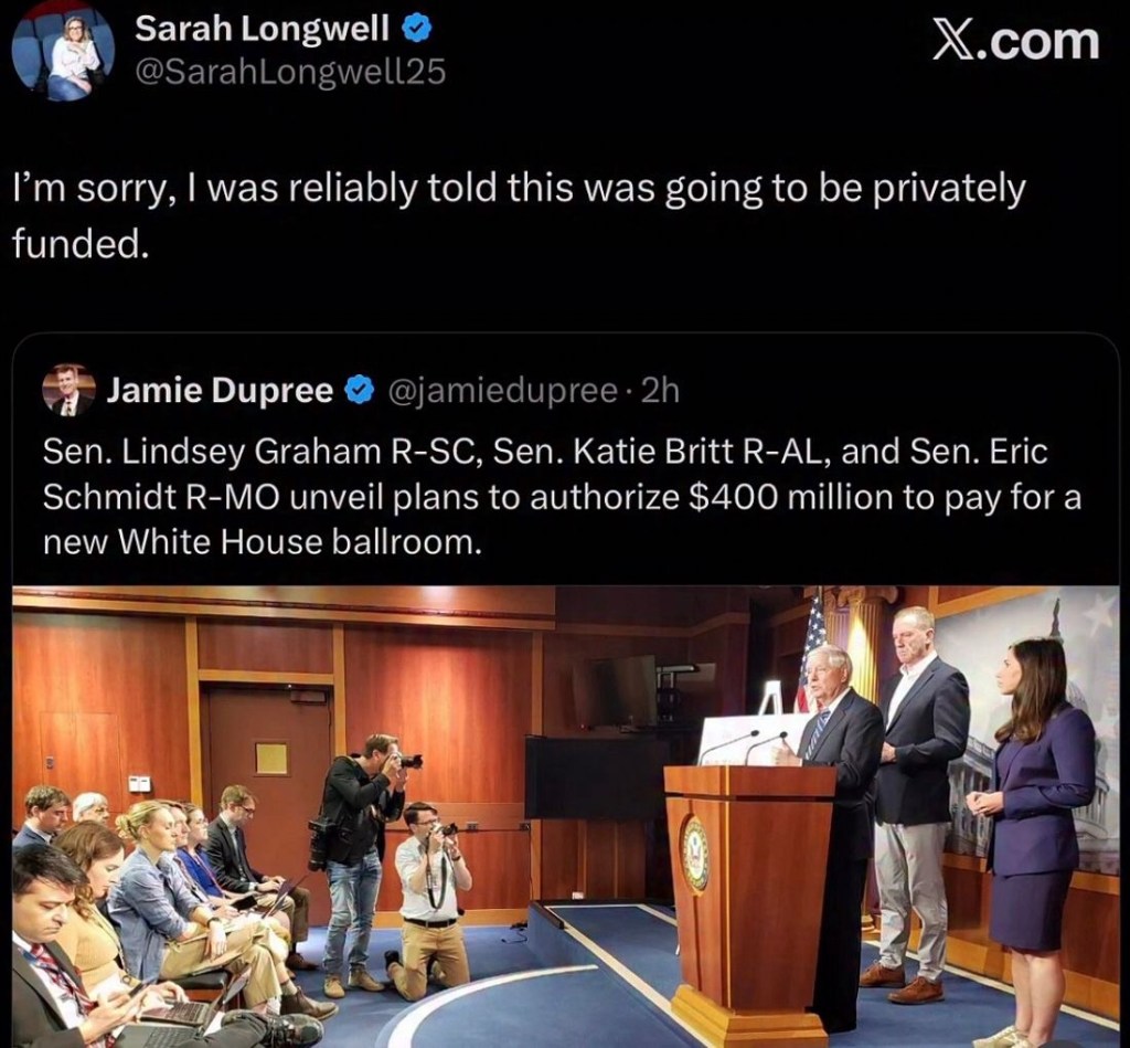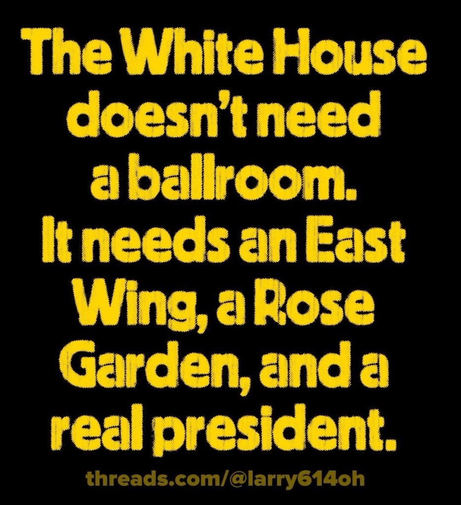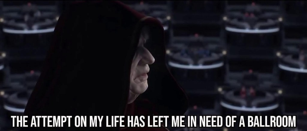 I’m less interested in the debate over the purpose of the ballroom — except, to say that I don’t buy the justification for a moment — and plenty of others have taken on that directly. The shortest possible objection is that we can’t possibly believe or agree that the world is too dangerous for the elected leader of a democracy to ever leave his compound and that all supplicants must come to him in order to have an audience (plus Trump’s ballroom is still way smaller than the ballroom of the Washington Hilton, so it’s not like it’s an actual replacement for hotel galas.)