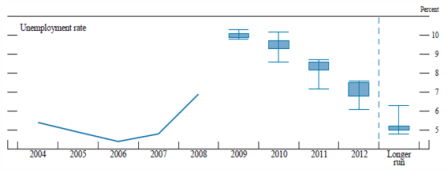 unemployment rate to 10% may cause policy makers to lose their sense of urgency. This graph is the projected unemployment being used by the FOMC. You can see that they are still expecting a rate above the NAIRU until the end of 2012. Looking at the number I found on structural unemployment, the joblessness rate may peak soon, but I doubt it will come down quite that fast.