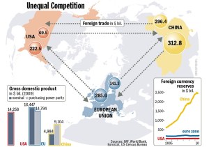 Posted: November 5, 2010 Filed under: Global Financial Crisis | Tags: APEC, currency devaluation, trade imbalances 8 CommentsYou had to know that it was eventually coming. I can’t pass up the chance to use a nifty graph for discussing stuff surrounding economics. This is from Der Spiegel. It will show you the value of trade between the U.S., China and the Eurozone plus a few other stylized facts. One set of data is GDP which is in the table down in the left. The other set in the right corner is foreign currency reserves which is a bunch of money sitting out there with lots of places to go. That is, unless you don’t have a pile and the EU and the U.S. don’t have a pile. (China had been using its pile to purchase U.S. Treasuries. )