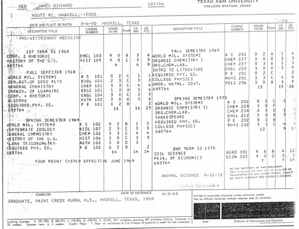 Perry also did poorly on classes within his animal science major. In fall semester 1970, he received a D in veterinary anatomy, a F in a second course on organic chemistry and a C in animal breeding. He did get an A in world military systems and “Improv. of Learning” — his only two As while at A&M.