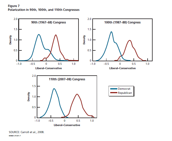 “If you want to understand the debt limit debate this year and the ongoing gridlock we are likely to experience for years, study this graph. In the late 1960s, the most conservative Democrats in the House and the most liberal Republicans voted together frequently enough (as shown by the overlap between the two distributions) to make centrist legislating successful. By the late 1980s, that overlap was dwindling. Today, it is largely gone.”