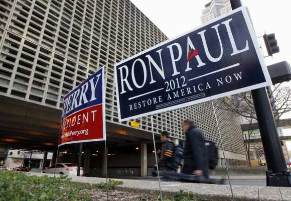 Competing campaign signs line the sidewalk in downtown Des Moines, Iowa, Tuesday, Jan. 3, 2012. (AP Photo/Chris Carlson)
