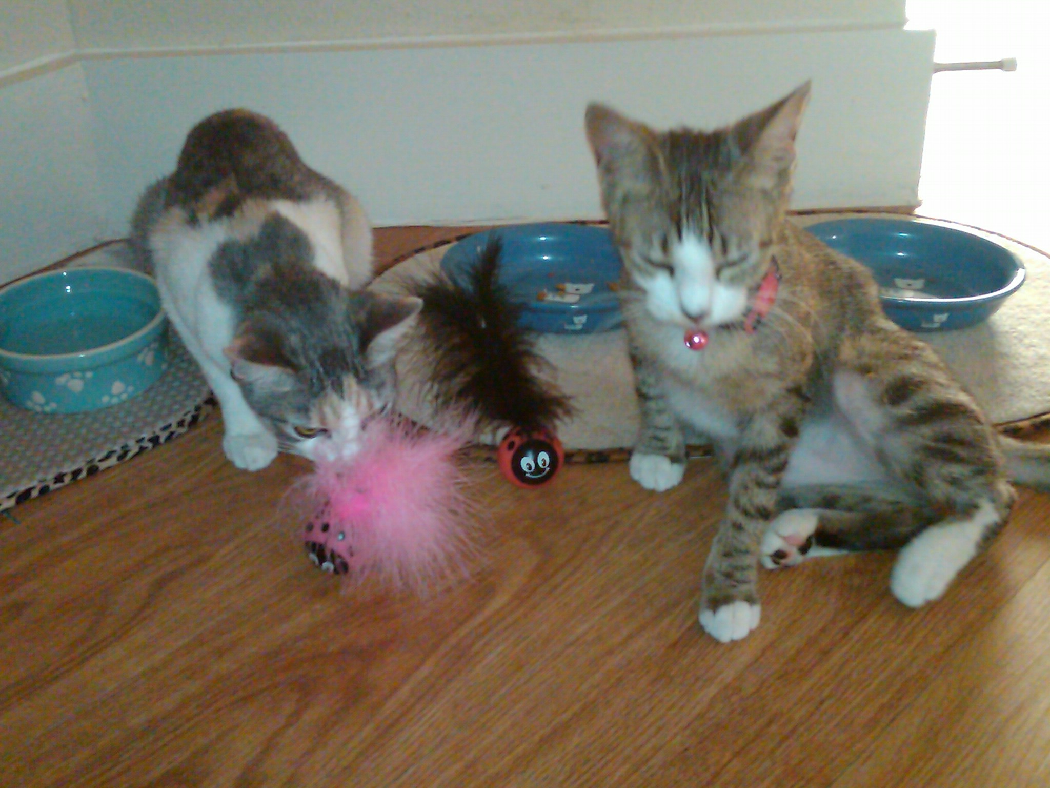 Lily is the darker one on the right with her eyes closed… and Rue is the one on the left eyeing the ladybug toy…