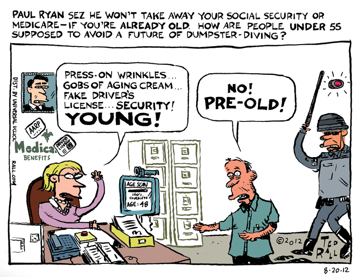 Paul Ryan says he won’t reduce Social Security or Medicare benefits if the Republicans win–at least not for people who are currently elderly. What about people under 55 years old–the pre-old? How are they supposed to avoid a future of dumpster-diving?