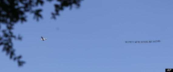 A plane with a banner reading “Hey Mitt We’re Voters, Not Victims” flies overhead as Republican presidential candidate and former Massachusetts Gov. Mitt Romney arrives for a Univision “Meet the Candidates” forum in Miami, Wednesday, Sept. 19, 2012. (AP Photo/Charles Dharapak)
