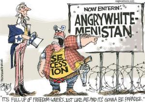 I hesitate to write this post since we already had a visitation from one set of angry white sucessionists but it appears to be the latest in a series of things that really makes me ask :”How many crazy, angry white people can one country harbor?” The last election has shown us a group of extremists that have moved from ‘taking back’ their country to basically leaving it. How on earth do these people still exist given the results of the civil war over 150 years ago? How long can you hold on to the idea that freedom means the freedom to be a tyrant to other people and to hate on them for not being like you? Have they ever heard of the stereotype of bitter, angry losers?