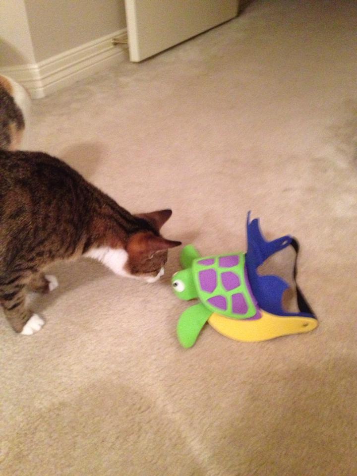 And wait, one more pic… one of my girls from the beginning of this year, doing their “terrapin terrific” best. Well, this is mostly just Lily bogarting and hamming it up for the camera, but you can see Rue’s little calico tush in the corner: