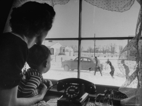 alfred-eisenstaedt-mother-and-child-looking-out-window-as-father-and-older-brothers-walk-to-car-in-snow