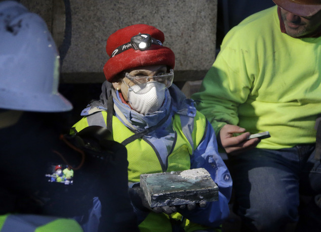 Pamela Hatchfield, a conservator at the Boston’s Museum of Fine Arts, holds a time capsule she had just removed from the cornerstone of the Statehouse in Boston, Thursday, Dec. 11, 2014. Secretary of State William Galvin said the 200-year-old time capsule is believed to contain items such as old coins and newspapers, but the condition of the contents isnt yet known. (AP Photo/Stephan Savoia)