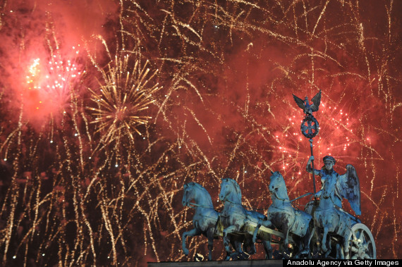 BERLIN, GERMANY – JANUARY 01: Fireworks light up the sky above the Brandenburg Gate during the welcoming ceremony for the new year in Berlin, Germany on January 1, 2015. (Photo by Cuneyt Karadag/Anadolu Agency/Getty Images)