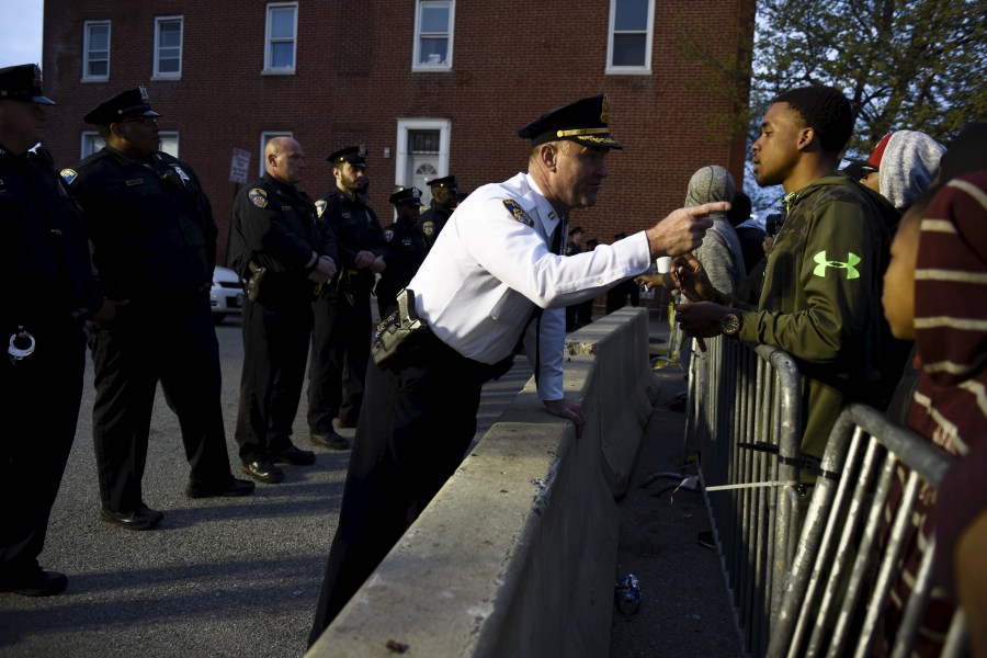Captain Erik Pecha of the Baltimore Police Department chats with a young demonstrator in front of the Baltimore Police Department Western District station during a protest against the death in police custody of Freddie Gray in Baltimore April 23, 2015. The U.S. Southern Christian Leadership Conference will independently investigate the death of a black Baltimore man in police custody, with the local head of the civil rights group saying it lacked confidence in a police probe into the death. REUTERS/Sait Serkan Gurbuz – RTX1A1YY