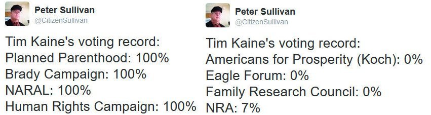 Come on you guys – I spent a long time in Virginia. They love him. Their current Governor will get to appoint his replacement. He was a civil rights lawyer for 15 years, mayor of Richmond, Governor of Virginia, speaks Spanish, beat the NRA, big tobacco, big coal and George Allen. 100% rating from Planned Parenthood and NARAL. F rating from the NRA (unlike Bernie Sanders). Did I want Warren? Yes. Do I like Kaine? Absolutely.