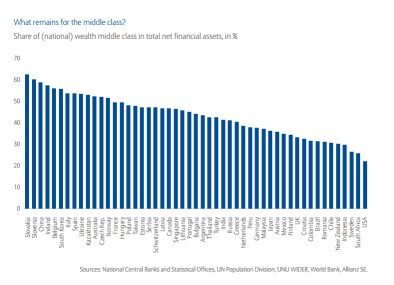 For the first time in this report series, Allianz calculated each country’s wealth Gini coefficient—a measure of inequality in which 0 is perfect equality and 100 would mean perfect inequality, or one person owning all the wealth. It found that the U.S. had the most wealth inequality, with a score of 80.56, showing the most concentration of overall wealth in the hands of the proportionately fewest people.