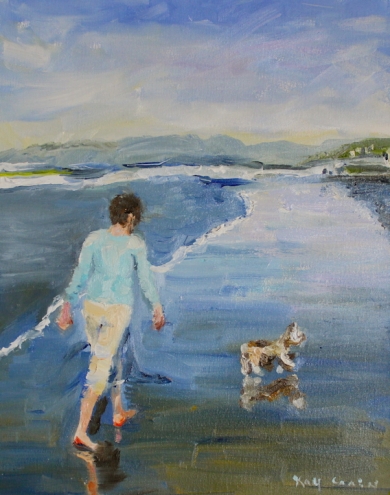Helen and Lizzie-Woman walking on beach wih yorkie dog Original art painting by Kay Crain