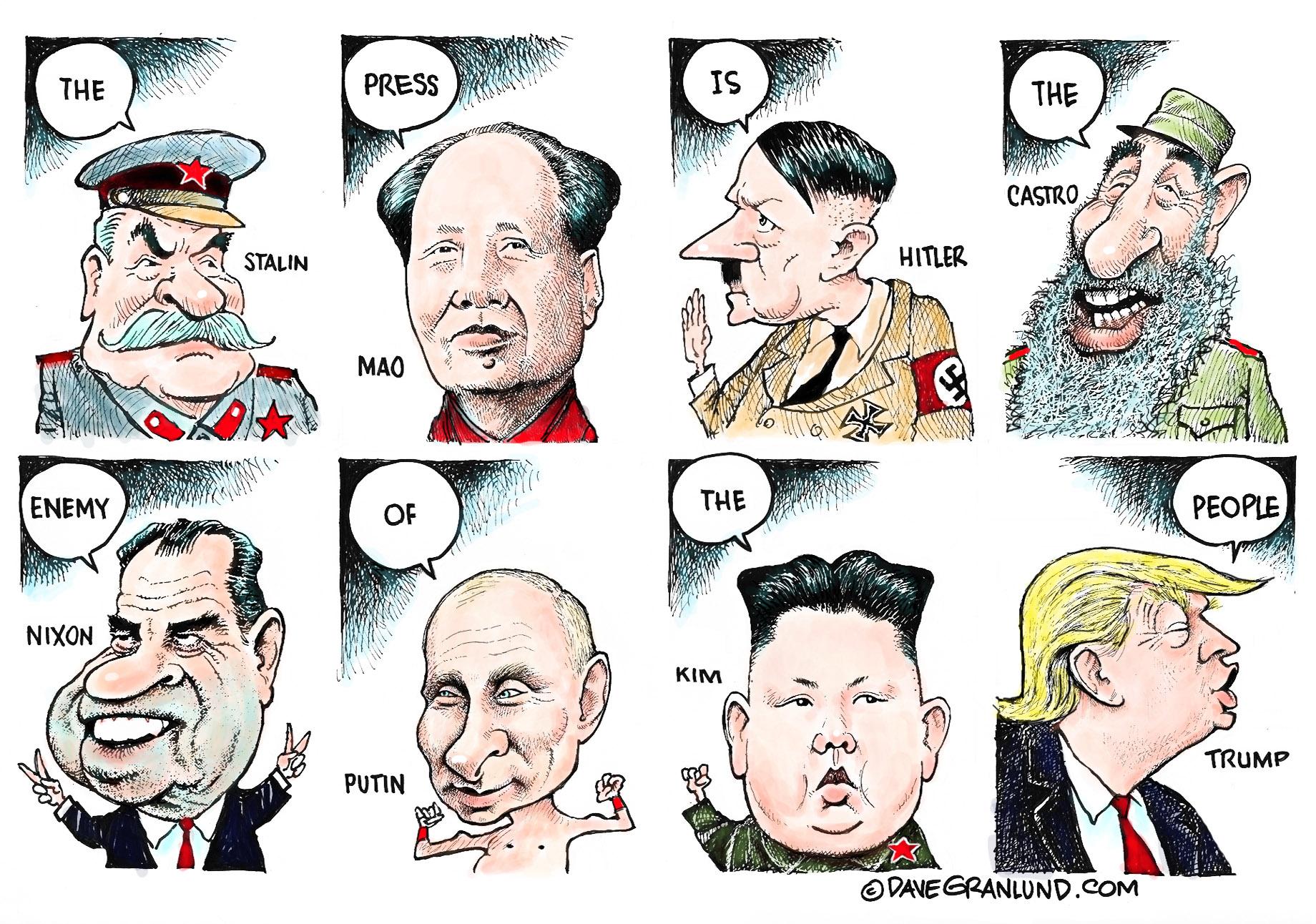 I have not voted for Trump nor will I. He is a buffoon at best. That said. He hasn’t called the press the enemy in quite the same context as his “illustrious” companions in the cartoon above. The current “Press” is hostile to American democracy. I was a reporter who grew up in the shadow of the Woodward and Bernstein days, back when the Washington Post could proudly state, “Democracy dies in darkness.” Now, the Post, the New York Times, CNN, NPR as well as their soulless right wing counterparts, Fox News, Breitbart, The Gateway Pundit et al, work tirelessly to create and perpetuate darkness.
