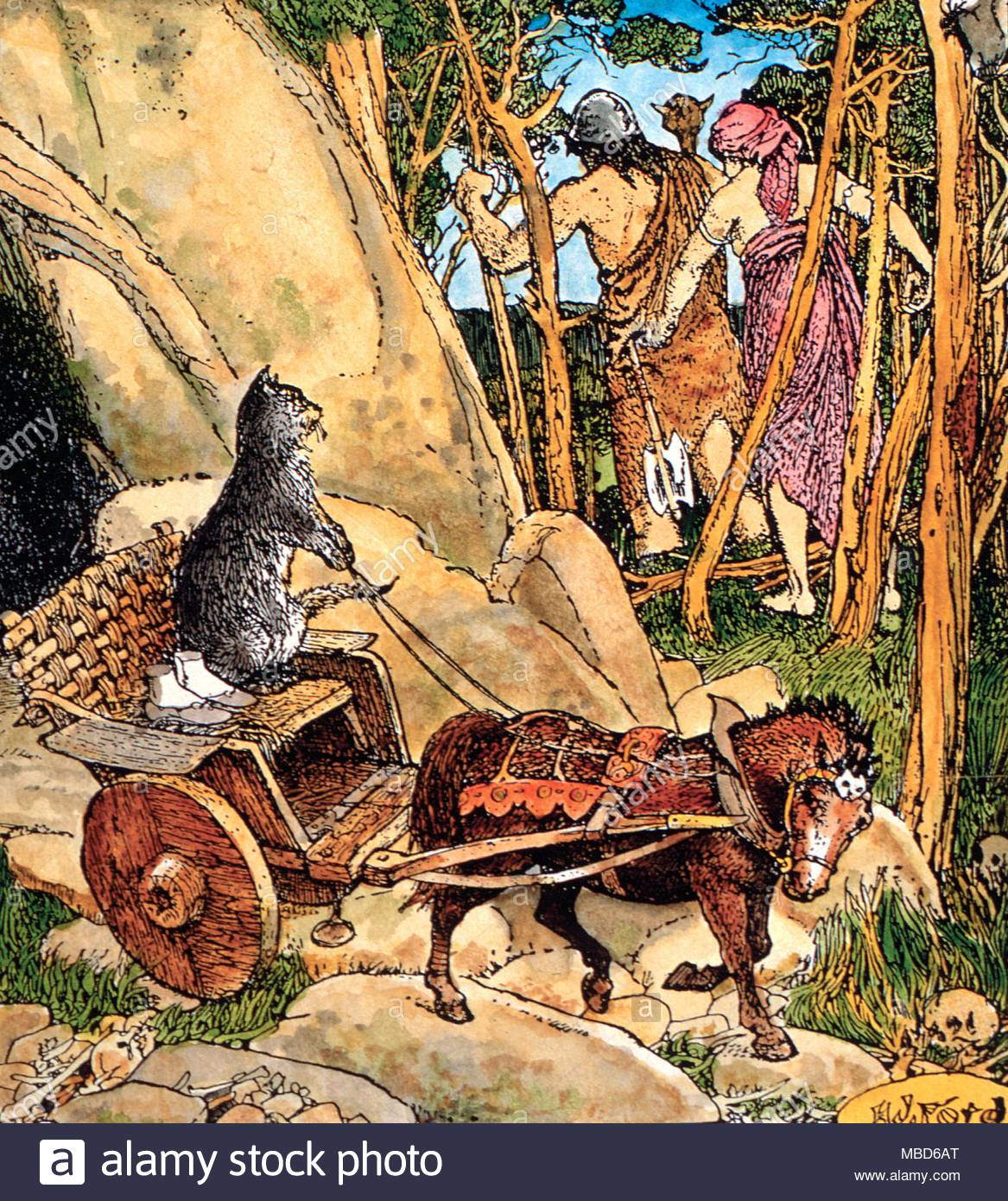 Kisa the Cat carries off Ingibjorg’s Feet from the giant’s cave, from Andrew Lang’s Brown Fairy Book, 1932