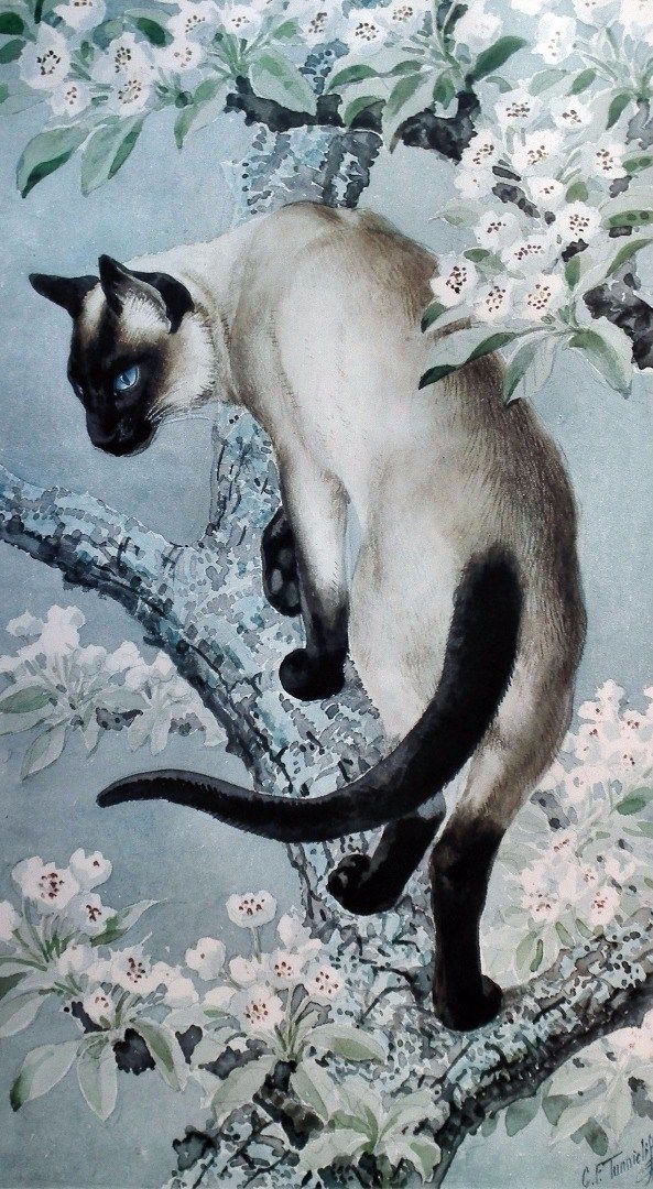 Charles Frederick Tunnicliffe Siamese cat on branch with apple blossom