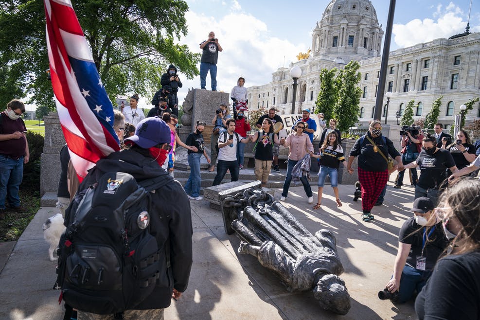 People danced in a circle around the Christopher Columbus statue after it was toppled on Wednesday night on the Minnesota State Capitol grounds in St. Paul.