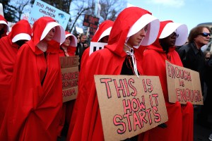 SACRAMENTO, CA – MARCH 24: Members of the Handmaid Coalition of California hold signs as they march to the California State Capitol during a March for Our Lives demonstration on March 24, 2018 in Sacramento, California. More than 800 March for Our Lives events, organized by survivors of the Parkland, Florida school shooting on February 14 that left 17 dead, are taking place around the world to call for legislative action to address school safety and gun violence. (Photo by Justin Sullivan/Getty Images)