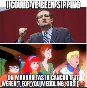 Okay, I couldn’t contain myself. More gratiutous Ted Cruz bashing today from his colleages: “Ted Cruz’s colleagues mocked him by putting memes of his Cancun trip in the Senate gym locker room: ‘Bienvenido de Nuevo, Ted!'” Guess I’ll never be considered to head the Budget office.