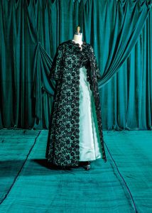 Graphic statement: A stately evening ensemble of black lace over aqua silk, for A. F. Chantilly, circa 1966.