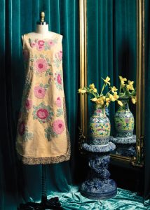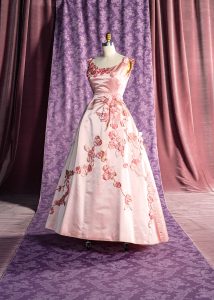 Blush pink was a favorite color of Lowe’s. Here she uses it in silk and nylon for an evening dress, from 1962, festooned with trompe-l’oeil flowers.