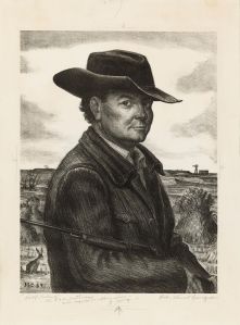 At the same time, guns are used to illustrate the idea of defense of land, hunting literature begins to describe a more intimate relationship with being “armed.” Loving descriptions of guns as “well-oiled,” “sleek” and “gleaming;” and being “cradled,” “caressed” and “hugged” by their owners proliferates. In The American Farm Hand of 1937 by Sandor Klein, a farmer seated in a cane chair looks directly at the viewer and clutches a shotgun halfway down the barrel. The rifle is closest to the viewer and the polished wood handle and steel barrel sensuously echo the sinewy arms and bare torso of its owner.