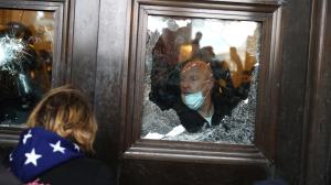 WASHINGTON, DC – JANUARY 06: A Capitol police officer looks out of a broken window as protesters gather on the U.S. Capitol Building on January 06, 2021 in Washington, DC. Pro-Trump protesters entered the U.S. Capitol building after mass demonstrations in the nation’s capital during a joint session Congress to ratify President-elect Joe Biden’s 306-232 Electoral College win over President Donald Trump. (Photo by Tasos Katopodis/Getty Images)