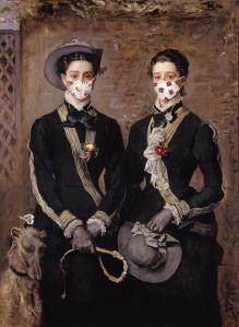 “The Twins, Kate and Grace Hoare” the sisters wear face coverings as they prepare for an outing with their elegant dog .John Everett Millais (1829–1896)