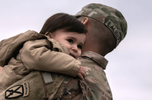 A US Army soldier holds his 1-year-old son after returning from a nine-month deployment to Afghanistan on December 10, 2020. John Moore/Getty Images