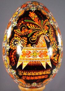 Oh, I see. I took the arching decorations above its head as antlers, but it’s more probably it’s a horse. The pysanky are found in many Slavic countries — well, the people all came from the same culture.