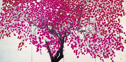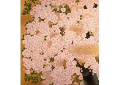 Hana no Yube or Flowers (Image of Evening) was made in 1938 by Funada Gyokuju. The power of this sizeable folding screen painting is in the scale of the cherry blossom tree.
