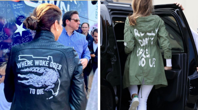 By contrast, Casey DeSantis’ coat is just like her husband Ron DeSantis’ campaign: Crude. Grasping. Saying the ugly part out loud. Whereas Trump would wink-wink at the fascists—who can forget his dog whistle to the “very fine people on both sides” at Charlottesville—DeSantis wants to peel off Trump’s base by being even more explicit about who he intends to target. You can see it right there on his wife’s jacket: DeSantis’ Florida is where the woke go to die—and a lot of other people die as well.