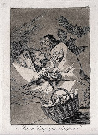 Three old hags surround a basket of newborn babies with bats in the distance. Etching by F. Goya, 1796/98.