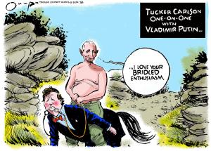 In fact, we probably should be just a little bit curious about what former Fox News celebrity Tucker Carlson was doing in Moscow last week interviewing Russian president Vladimir Putin. Carlson has demonstrated his affinity for Putin for years now and is commonly extolled on the Russian state television channels as a model American with all the right ideas. Back in March of 2022, Mother Jones obtained a copy of a Kremlin memo with talking points for the media: