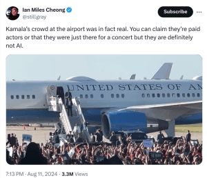 Yesterday, he adopted the hysterical claims of some of his followers, posting that Vice President Harris was cheating because (he falsely claimed) she had used AI to sub in a crowd of people who weren’t there.