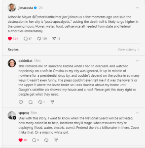 The floods caused by Helene could be another. Right wingers are already trying to ensure this works like Katrina did for George W Bush. And whatever else, the flooding disproportionately affected the rural areas that Trump needs to win North Carolina (though North Carolina voters can forego voter ID requirements under an emergency exception). That said, the Helene response may also highlight two things — FEMA and NOAA — that Project 2025 aims to defund. Tennessee Governor Bill Lee’s attempt to forgo federal help may provide a contrast that shows how Federal help can make a difference in a catastrophe. And a whole bunch of conservative people just got bowled over by the impact of climate change, hundreds of miles from the nearest coast. If the Feds can respond to the damage on I-40 like they did to the I-95 or the Francis Scott Key Bridge disaster, it may convince people in North Carolina that the government can too do something good.