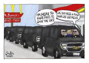 It was likely just a playdate that made him feel good about himself, but this Independent Headline was harsh.”Is this the publicity stunt that secures the White House for ‘McDonald Trump’? If Donald Trump serving fries at a Pennsylvania drive-thru doesn’t clinch him the swing state, then a side order of Elon Musk just might, says Sean O’Grady.” His staff was likely relieved he didn’t get a chance to talk about Arnold Palmer’s Penis or telling a little boy there would be no more cows if the Vice President became President.