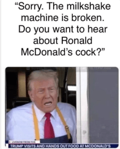Anyone who isn’t a washed-up Reality Star or someone who thinks those reality shows are staged was probably as weirded out by Trump’s stage MacDonald’s Act that appeared aimed at the Vice President. He is acting weird at a privately owned McDonald’s, which closed down for the day and specifically coached chosen customers to be good foils. This antic has so many obvious mistakes that it’s like an outtake from a bad movie. He wasn’t wearing a hat/hair net, gloves, etc. You actually have to have food handler training and certification to do the job. He’s a felon. MacDonald’s doesn’t hire felons. The Independent’s Kelly Rismann reports it far better than me. All I can say is they probably had to scrub the entire place down between his farting and hair loss issues. He probably didn’t even wash his hands. “McDonald’s workers roast Trump over ‘insulting cosplay’ stunt at restaurant that failed health inspection. Trump sported neither gloves not a hair net as he worked at a branch of the fast food chain in Pennsylvania.”