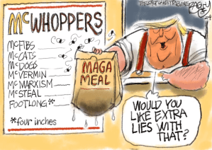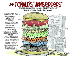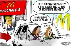 The proud Americans he served prefer Big Macs and Filet-O-Fish to eating pet dogs and cats or (as per the Trumpian fantasy) wild geese like those nasty illegal immigrants – and so found themselves worthy of Trump’s courtesy.