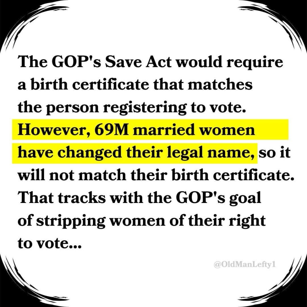 The Save Act has already passed the House and is intended to suppress the vote among women. This is the 1st step in the GOP's effort to take away women's right to vote.