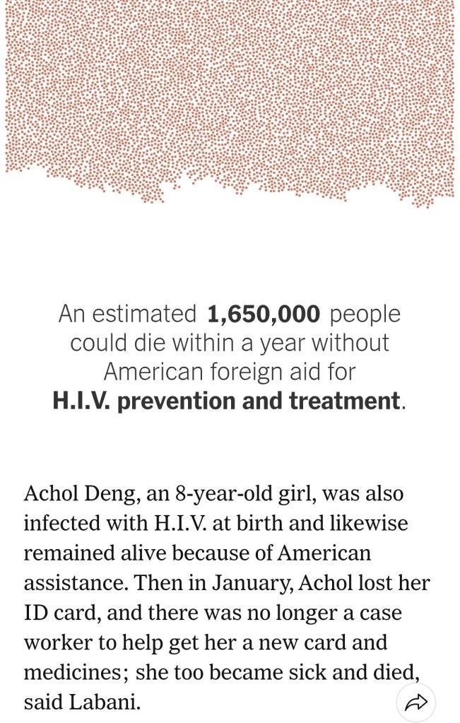 Another household kept alive by American aid was that of Jennifer Inyaa, a 35-year-old single mom, and her 5-year-old son, Evan Anzoo, both of them H.I.V.-positive. Last month, after the aid shutdown, Inyaa became sick and died, and a week later Evan died as well, according to David Iraa Simon, a community health worker who assisted them. Decisions by billionaires in Washington quickly cost the lives of a mother and her son.