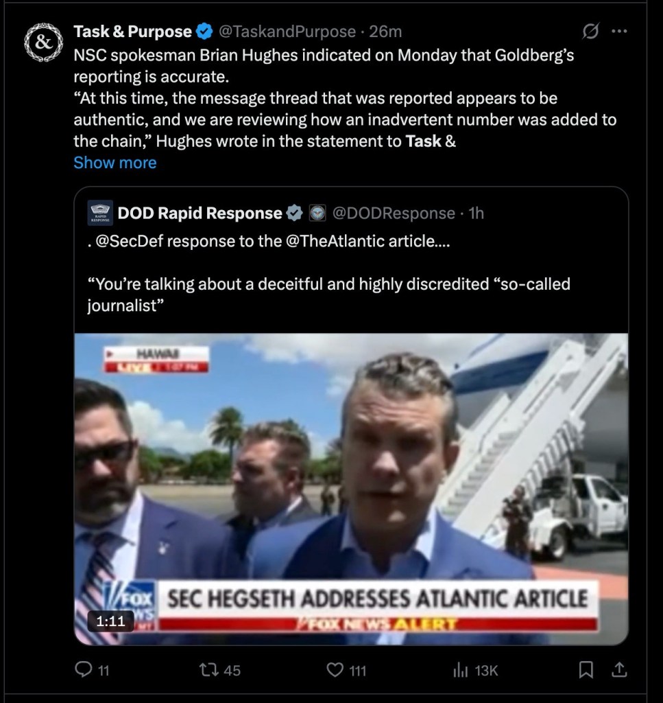 Goldberg: The Secretary of Defense seems like a person who is unserious and is trying to deflect from the fact that he participated in a conversation on an unclassified messaging app that he probably shouldn’t have participated in