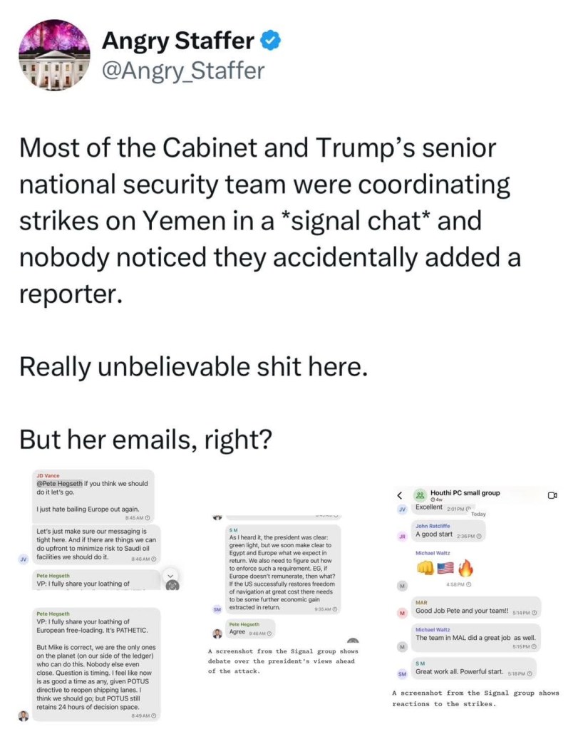 But the effort to claim this is just a mistake in the creation of the Signal list is an attempt to downplay that Trump’s CIA Director, John Ratcliffe, sent the identity of a currently serving intelligence officer and later sent what appears to be sources and methods on Signal, and then his Secretary of Defense, Whiskey Pete Hegseth, sent operational details of the imminent strikes on Yemen on Signal, and then Waltz himself sent out what sound like the immediate results of the operation, also on Signal.
