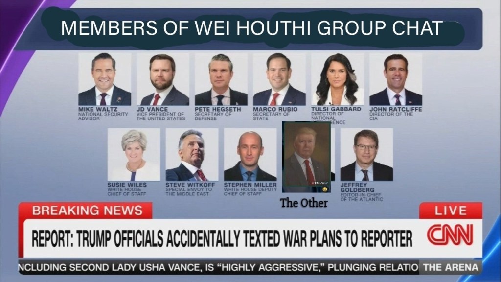 This illegal national security group chat has everything, Houthi bombing plans, JD Vance xenophobia, improper emoji use, the editor of the Atlantic Magazine thinking he got punked, Pete Hegseth day drinking, and MTV’s Dan Cortese.